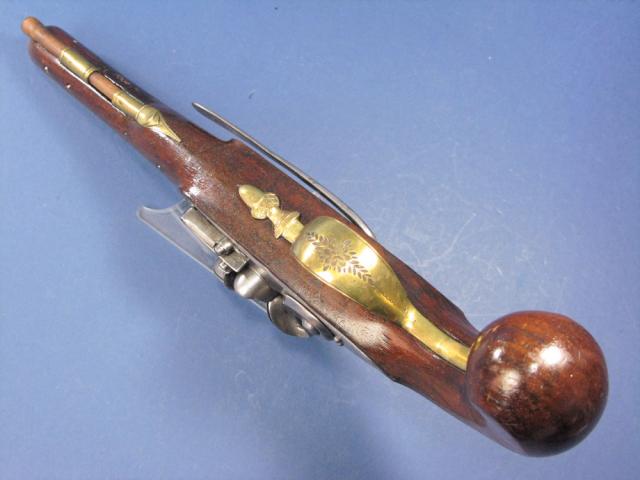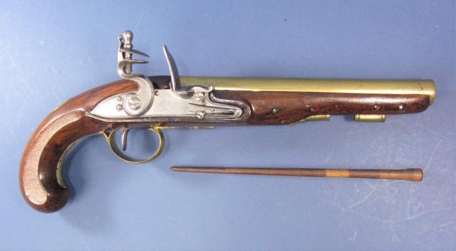 Engels marine vuursteen pistool gemaakt door "Ketland & Co" rond 1780-1790 in zeer goede staat. Gladde ronde messing loop kaliber 13,7 mm met boven op de loop het opschrift "LONDON" en met geometrische gravure tot het midden van de loop. Tang gegraveerd met florale motieven. Goed werkend vuursteenslot met vlakke slotplaat, in het midden gesigneerd "KETLAND & Co", met omlijnde randen. Notenhouten kolf met een op de achterkant een gegraveerd schild met monogram. IJzeren riemhaak, messing monturen en houten laadstok.