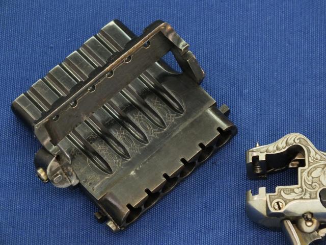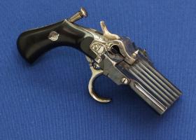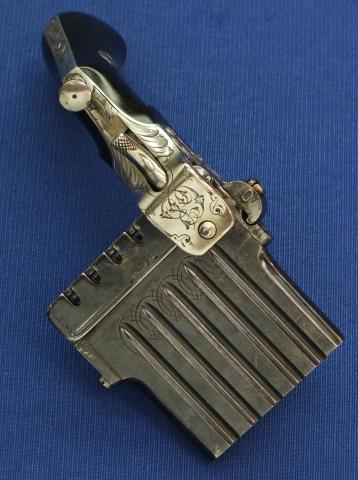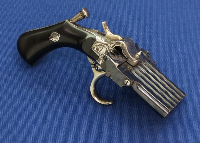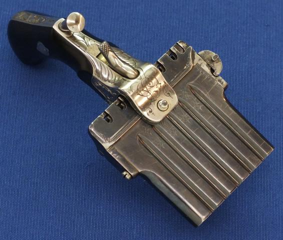 Een zeldzame gegraveerde Franse 6 schots double action Jarre Harmonica pinvuur pistool in kaliber 7mm. Lengte 15,5cm.