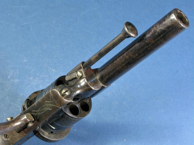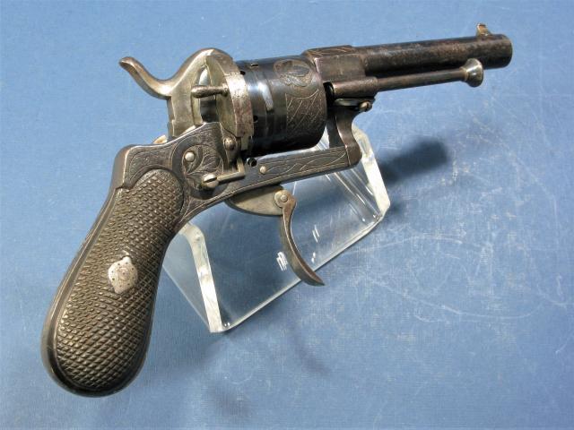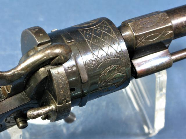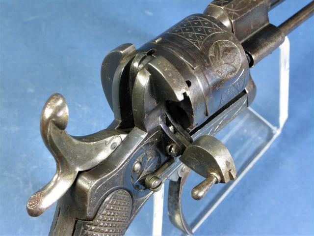 Mooie geblauwde 7 mm 6 schots penvuur revolver in zeer goede originele staat. Luiks ELG keurmerk en een inspecteurs keurmerk op de cilinder. Perfect werkend mechanisme in zowel sa als da. Checkered ebbenhout kleurige greepjes in mooie staat. Voorzien van laadpoort en uitwerpstang.