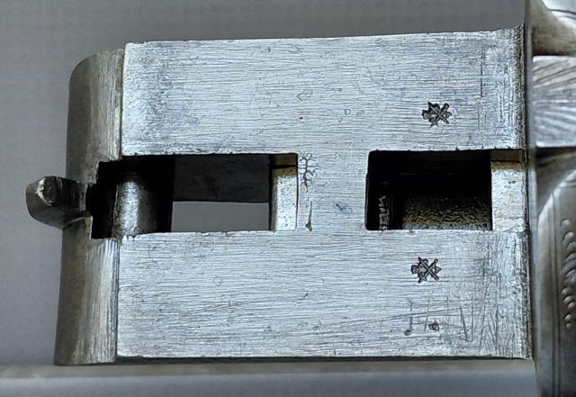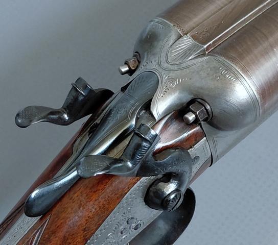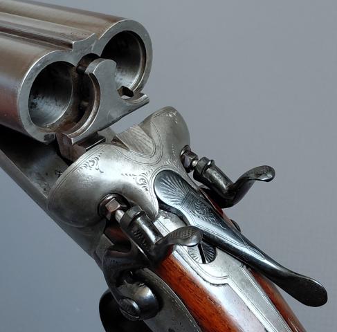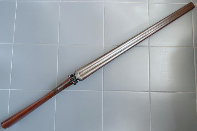Het geweer is in erg nette, gebruikte staat. Hij spant en sluit netjes en inwendig zijn de lopen nog vrij glad met slechts wat lichte spikkeltjes/plekjes aan pitting. Het geweer is voorzien van Britse zwartkruit proefbankstempels, een maker staat er helaas niet op vermeld.