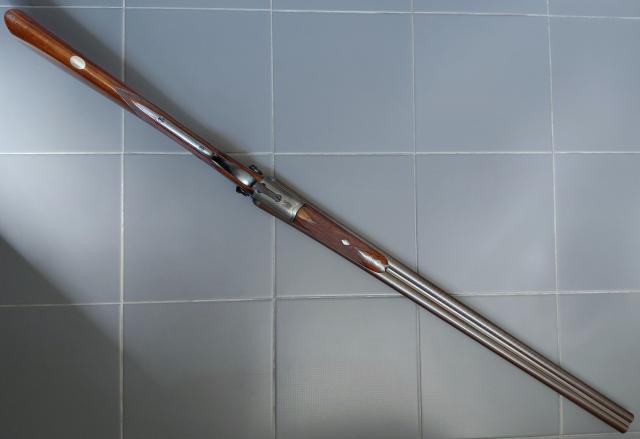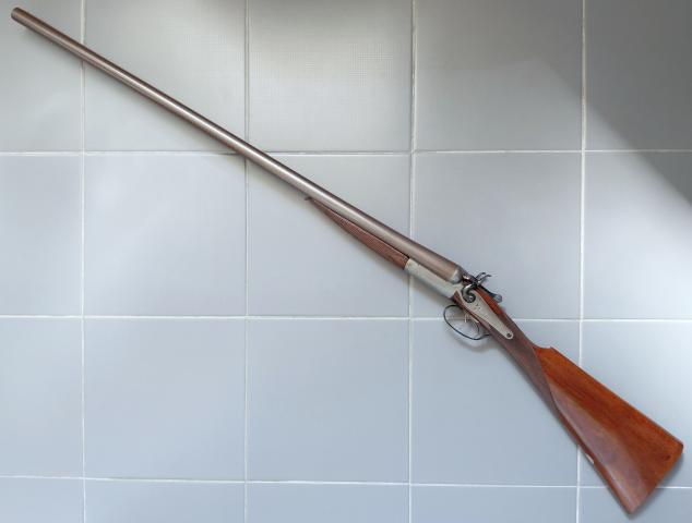 Aangeboden: Antiek Brits dubbelloops hagelgeweer in kaliber 12 met toplever sluiting.