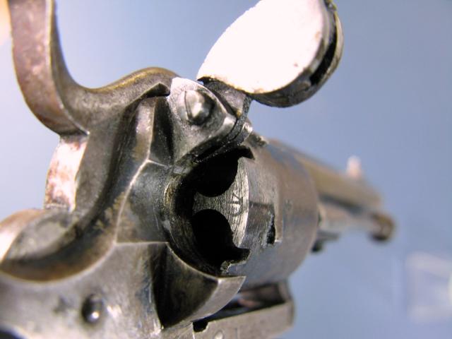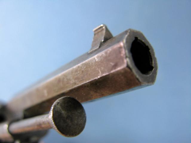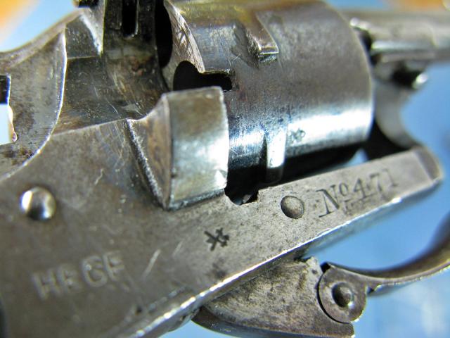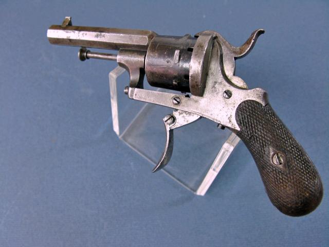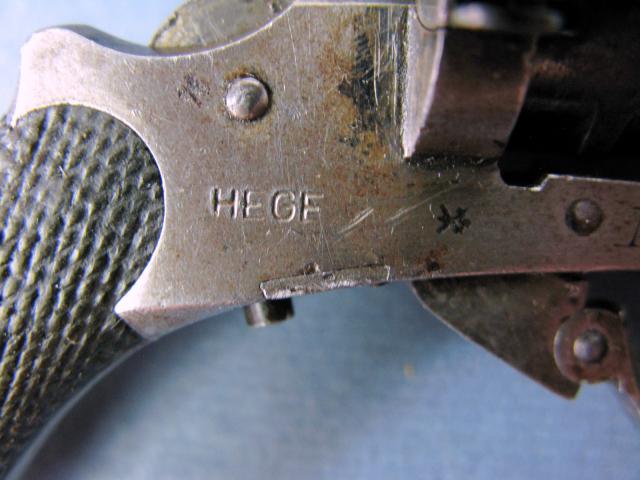 Mooi, origineel, klein 5 mm 6 schots penvuur revolver in zeer goede staat. Geblauwde loop en cilinder waarvan op de cilinder nog de meeste blauwing aanwezig is. Belgische keurmerken op cilinder en loop. Op frame genummerd No 471 Hege. Goed werkend mechanisme in zowel sa als da. Notenhouten checkered greepjes. Lengte 13 cm.