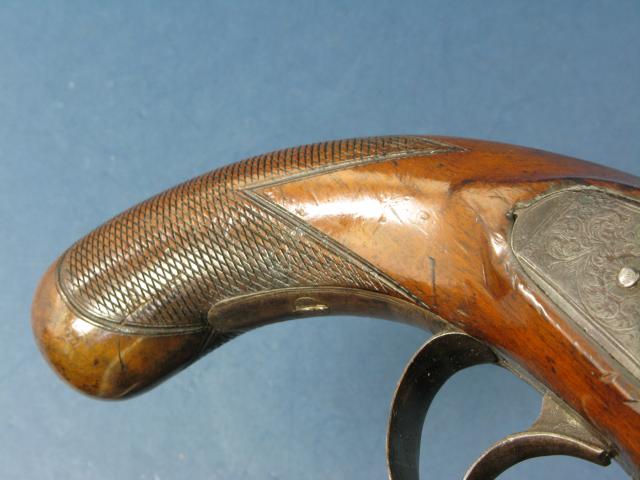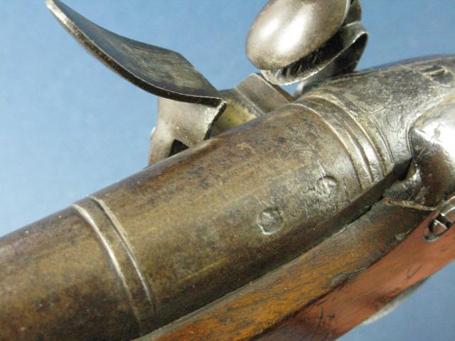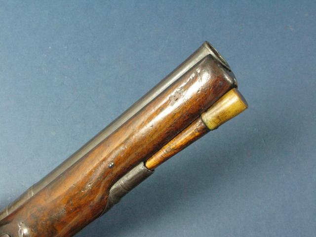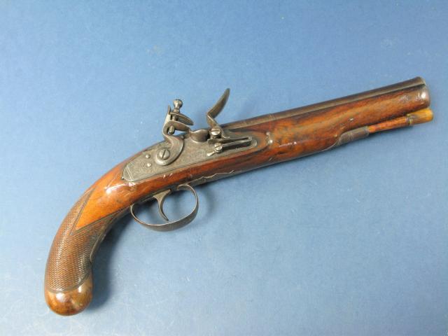 Engels vuursteen pistool gemaakt door rond 1790 in zeer goede staat. Gladde ronde loop kaliber 17 mm met boven op de loop het Londense keurmerken. Goed werkend vuursteenslot met vlakke licht gegraveerde slotplaat en omlijnde randen en vergulde pan. Notenhouten kolf met checkered greep, houten laadstok met hoornen punt. Lengte 38 cm