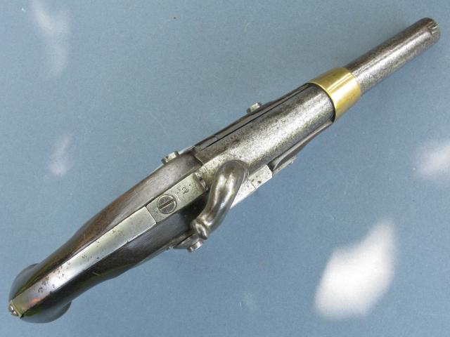 Mooi Frans percussiepistool model 1822 T cavalerie. Dit pistool model 1816 is oorspronkelijk gebouwd als vuursteenpistool en is later vanaf 1841 omgebouwd tot het percussie systeem. Het model heette daarna 1822 T. Na 1860 werden bijna alle pistolen omgebouwd naar het model 1822 T Bis. Dit pistool heeft die laatste transformatie niet ondergaan en heeft ​​het originele slot met de vermelding "Manufacture Royale de Tulle". Gladde loop met klein vizier, gemerkt C 17.6. Het slot werk zeer goed en de haan spant met strakke veer in twee standen. Het hout is erg mooi met gebruikssporen passend bij de leeftijd. Al het messing beslag heeft keurmerken. Metalen laadstok met merkteken V.