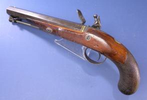 Engels vuursteen pistool gemaakt door “Thomas Gill” rond 1790-1800 in zeer goede staat. Gladde achthoekige loop kaliber 17,5 mm met boven op de loop het opschrift “LONDON” , gegraveerde tang met gouden bandversiering. Goed werkend vuursteenslot met met veiligheidsschuif wanneer gespannen in de eerste klik. Verguld zundgat. Waterdichte pan met een typisch Engelse rol op de batterijveer. Slotplaat gesigneerd “T Gill”. Notenhouten kolf met checkered greep mooie patine en zilveren duimplaatje, kleine restauratie aan de lade rechtsvoor. Geďntegreerde metalen laadstok.