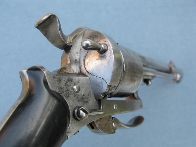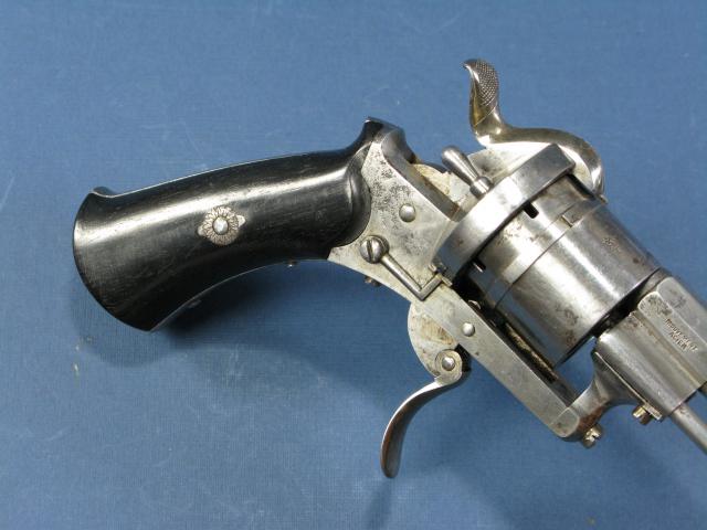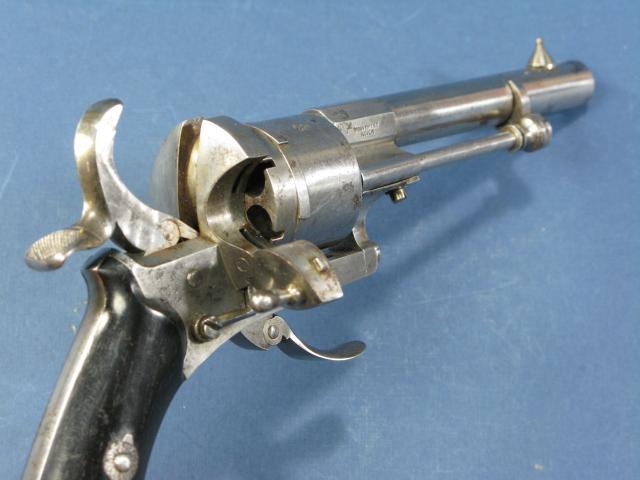 Zeer degelijk Frans 7 mm 6 schots penvuurrevolver in uitstekende staat. Gemerkt op de loop Fabrique St Etienneen voorzien van een Frans St Etienne keurmerk op cilinder. Op loop gemerkt met Movement Acier. Perfect en opvallend strak werkend werkend mechanisme in zowel sa als da. Ebbenhouten greepjes.
