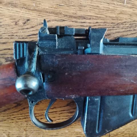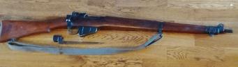 Lee Enfield, oud hollands onklaar gemaakt. Geen bewegende delen, loop dichtgelast. Met bajonet.