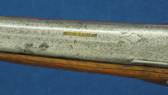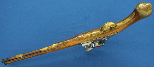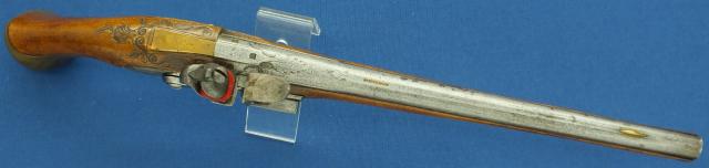 18e eeuws Nederlands vuursteen pistool van Oger Leblan Maastricht. Kaliber 15mm. 53cm lang. Loop met signatuur en 3 Maastricht keuren.