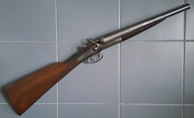 Aangeboden: Antiek Brits dubbelloops hagelgeweer "coach gun" in kaliber 12 met toplever sluiting.