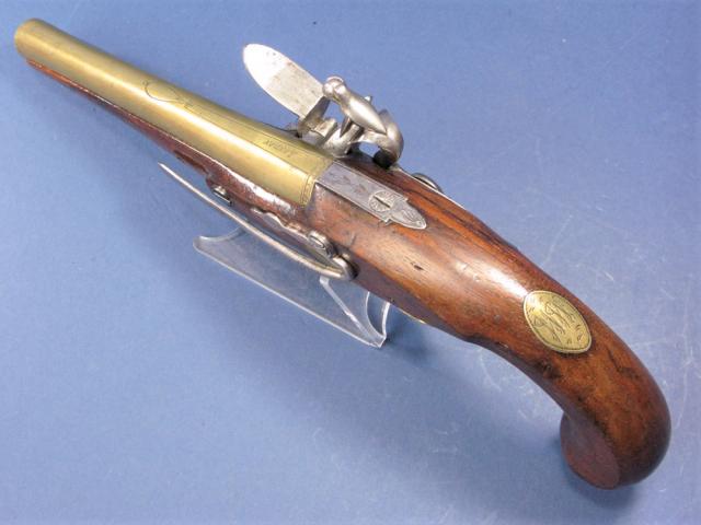 Engels marine vuursteen pistool gemaakt door "Ketland & Co" rond 1780-1790 in zeer goede staat. Gladde ronde messing loop kaliber 13,7 mm met boven op de loop het opschrift "LONDON" en met geometrische gravure tot het midden van de loop. Tang gegraveerd met florale motieven. Goed werkend vuursteenslot met vlakke slotplaat, in het midden gesigneerd "KETLAND & Co", met omlijnde randen. Notenhouten kolf met een op de achterkant een gegraveerd schild met monogram.