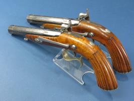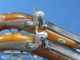 Prachtig koppel percussie pistolen Canon Dacier uit de eerste helft van de 19e eeuw. Achthoekige geblauwd stalen loop, kaliber 17,5 mm. Gegraveerde tang en voorliggende goed werkende percussiesloten. Gegraveerd beslag van berlijns zilver. Mooi walnotenhouten kolf met renaissance type grepen, eentje met een restauratie. In de grepen ruimte voor percussie caps. De pistolen zijn voorzien van riemhaken wat zou kunnen duiden op een maritieme oorsprong. Houten laadstokken.