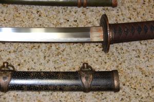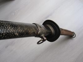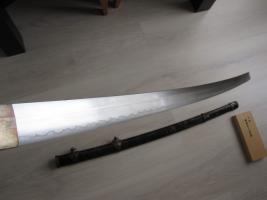 WW2 Imperial Japanese Navy officier zwaard "Kai gunto " gesigneerd , in zeldzame uitstekende conditie. Nagasa 66,5 cm , geen onderdeel vervangen , alles origineel en behoort tot dit zwaard. Tsuba en seppas hebben gelijke nummers. Meer fotos in betere kwaliteit op aanvraag. |