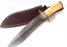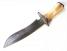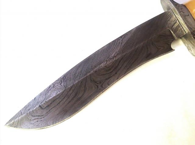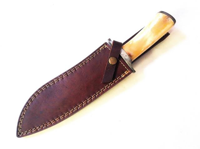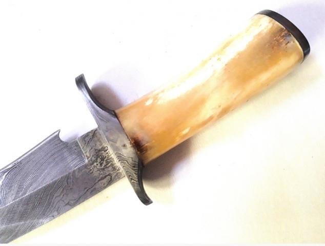 Oud bowie damascus mes met schede. Lengte 35 cm. Lemmet gemaakt van damascus staal. Handvat gemaakt van mooi gevlamd been. Schede is naderhand op maat bijgemaakt.
