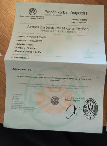 Er zit een proces verbaal bij om aan te tonen dat het hier gaat om een wapen uit klasse D.