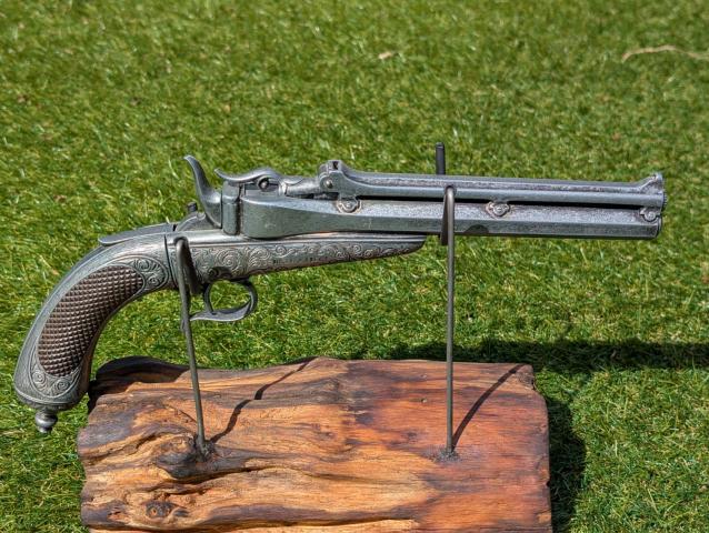 Prachtige replica van een Jongen a Liege pistool, ideaal voor decoratie of als verzamelobject. Het pistool is gedetailleerd afgewerkt en staat op een robuuste houten standaard. Een uniek stuk voor liefhebbers van historische wapens of als opvallend interieurstuk.