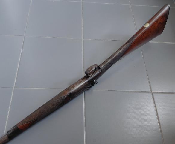 Het geweer is in nette, gebruikte staat. Hij spant en sluit netjes en inwendig is de loop nog mooi glad met slechts wat lichte spikkeltje/plekjes aan pitting. Het geweer is gemaakt door de Britse geweermaker C. Naylor en is voorzien van Britse zwartkruit proefbankstempels. Een enkelloops (Brits) hagelgeweer in kaliber 12 met toplever sluiting zie je niet zo vaak als de dubbelloops variant...