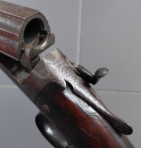 Aangeboden: Antiek Brits enkelloops hagelgeweer in kaliber 12 met toplever sluiting.