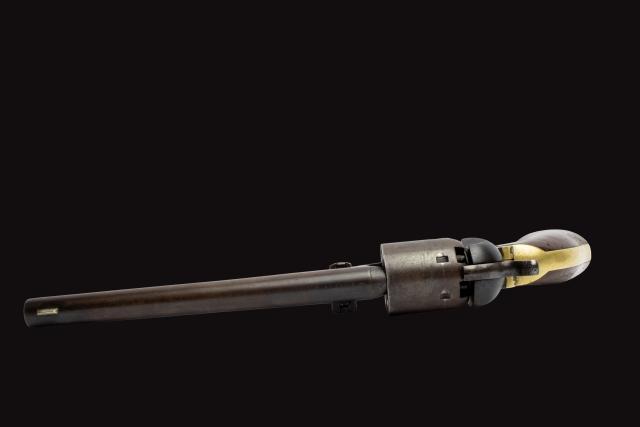 Te koop aangeboden een Colt Model 1861 Navy percussion revolver. Kaliber .36, 6 schots gefabriceerd in 1863. Deze revolver verkeerd in NRA Fine conditie. Loop en cilinder hebben +/- 40% diep tot medium origineel blauw, cilinder scene is licht gerold (bekend bij 61 Navies) en voor 90% zichtbaar aanwezig. Revolver is geheel serienummer gelijk. Loop heeft mooie trekken en velden met wat lichte pitting, mechanisch perfect. www.rkantiquearms.com
