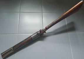 Het geweer is in nette, gebruikte staat. Hij spant en sluit netjes en inwendig zijn de lopen nog vrij glad met wat lichte plekjes aan pitting (met name aan het einde van de kamers). Het geweer is gemaakt door H. Holland, zoals waarschijnlijk de allerbekendste Britse geweermaker in het hoogste segment toen nog heette voordat Harris Holland en zijn neef Henry Holland in 1876 verder gingen onder de naam Holland & Holland. Het geweer is voorzien van Britse zwartkruit proefbankstempels. Een vrijgesteld hagelgeweer van deze maker zie je maar zelden ergens te koop...