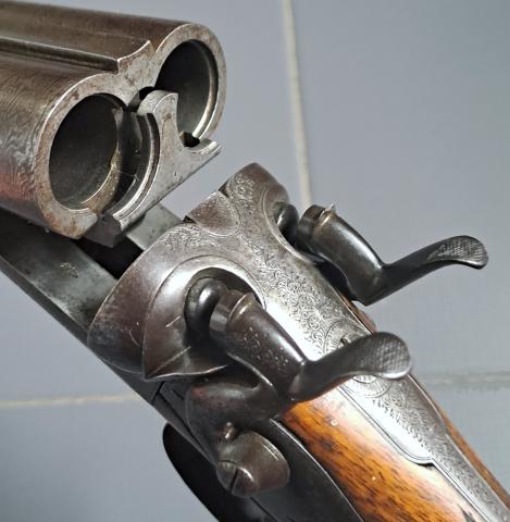 Het geweer is in nette, gebruikte staat. Hij spant en sluit netjes en inwendig zijn de lopen nog vrij glad met wat lichte plekjes aan pitting (met name aan het einde van de kamers). Het geweer is gemaakt door H. Holland, zoals waarschijnlijk de allerbekendste Britse geweermaker in het hoogste segment toen nog heette voordat Harris Holland en zijn neef Henry Holland in 1876 verder gingen onder de naam Holland & Holland. Het geweer is voorzien van Britse zwartkruit proefbankstempels. Een vrijgesteld hagelgeweer van deze maker zie je maar zelden ergens te koop...