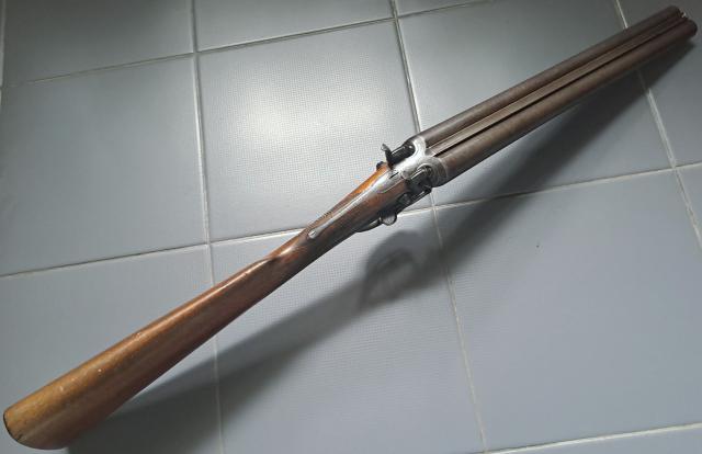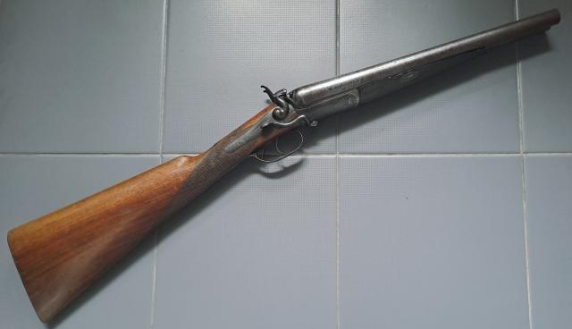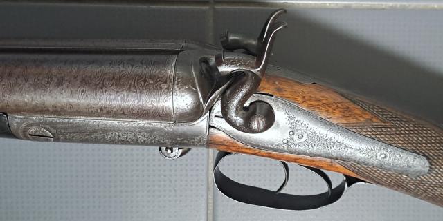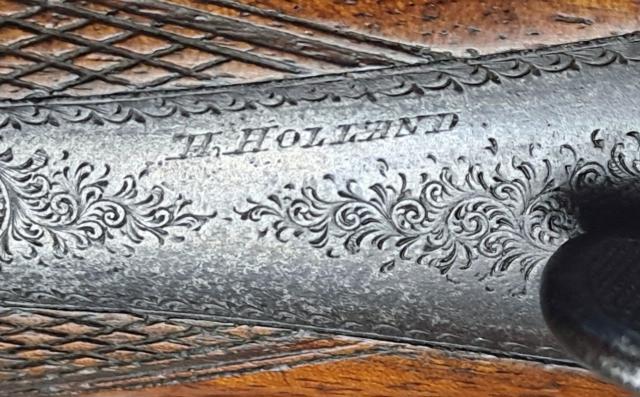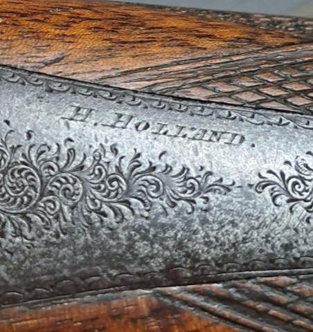Het geweer is in nette, gebruikte staat. Hij spant en sluit netjes en inwendig zijn de lopen nog vrij glad met wat lichte plekjes aan pitting (met name aan het einde van de kamers). Het geweer is gemaakt door H. Holland, zoals waarschijnlijk de allerbekendste Britse geweermaker in het hoogste segment toen nog heette voordat Harris Holland en zijn neef Henry Holland in 1876 verder gingen onder de naam Holland & Holland. Het geweer is voorzien van Britse zwartkruit proefbankstempels. Een vrijgesteld hagelgeweer van deze maker zie je maar zelden ergens te koop...