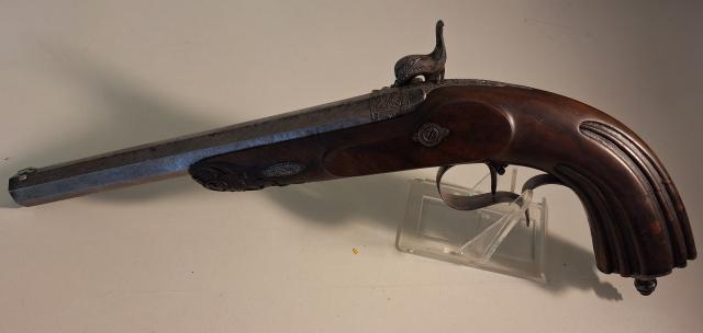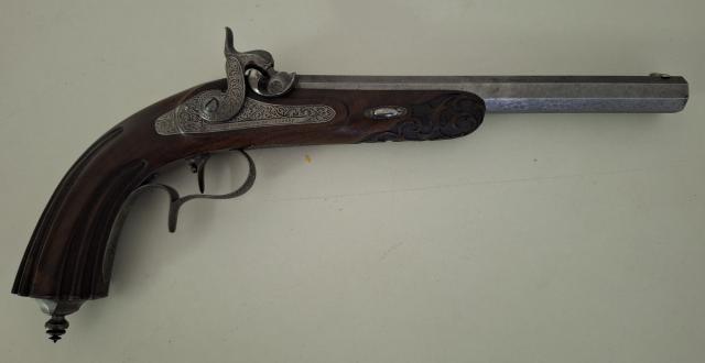 Voorlaadpistool met trekkerversneller cal .400 en gemaakt door H Guntermann uit Düsseldorf.