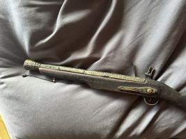 | Antiek VOC musket "Verenigde Oost-Indische Compagnie" - 1698 (het eerste compagnie ter wereld) Dit zeldzame antieke VOC-musket, bekend als "The East India Beholder", dateert naar schatting uit 1698. Het musket is voorzien van een unieke mix van amateurhoutwerk en officieel ogend goudkleurig gietijzer. Met zijn rijke historie en VOC-verbinding is dit een waardevol stuk voor verzamelaars van militaria en VOC-gerelateerde voorwerpen. Het musket wordt verkocht in de staat zoals weergegeven op de fotos en wordt uitsluitend gebruikt ter decoratie of als historisch stuk. oorspronkelijk afkomstig uit Rotterdam en een groot deel van de 17e eeuw de wereld rond gevaren. | ||||||||||||||