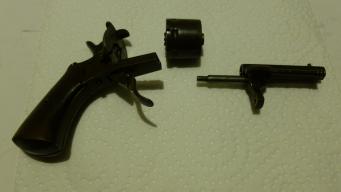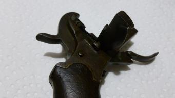 Lefaucheux type, penvuur revolver. Op de trommel staat het volgende opschrift: "The Guardian, Amercano deze revolver heeft Luikse, merken en te situeren rond 1870.Dit type de penvuur revolver werd geproduceerd voor de Amerikaanse markt door Fagnus & Clement in Luik, België. De revolver werd vervaardigd in zeven calibers,7 mm, 9 mm en 12 mm. Dit is het 7 mm model,de Guardian revolver beschikt over een hardhouten kolf. Het laadklepje is aanwezig.Is compleet en volledig origineel,op één vijsje na.Trekker en cylinder werken.Wel moet na elk schot de trekker terug naar voor worden geduwd,(na te zien). Alle fotos maken deel uit van de omschrijving. Lengte:16 cm.Ophalen kan.Verzenden in overleg maar ten laste van de koper.