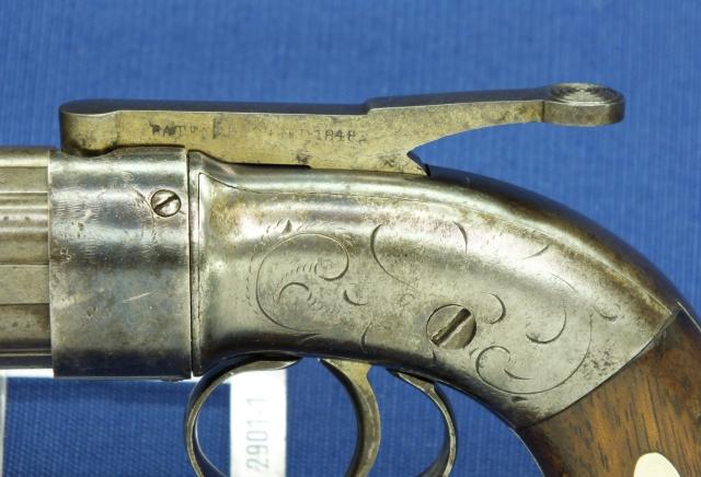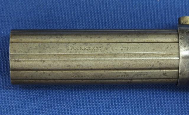 Een mooie Amerikaanse perkussie Pepperbox van Stocking & Co, Worchester, Massachusetts. Kaliber .28, 21cm lang. Nog resten van originele finish.