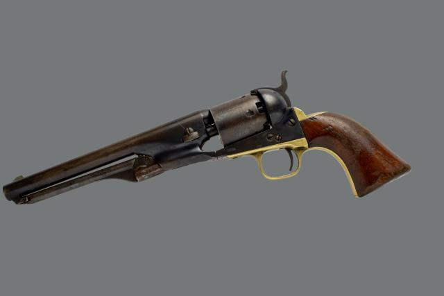 Te koop aangeboden een Colt Model 1861 Navy percussion revolver. Kaliber .36, 6 schots gefabriceerd in 1863. Deze revolver verkeerd in NRA Fine conditie. Loop en cilinder hebben +/- 40% diep tot medium origineel blauw, cilinder scene is licht gerold (bekend bij 61 Navies) en voor 90% zichtbaar aanwezig. Revolver is geheel serienummer gelijk. Loop heeft mooie trekken en velden met wat lichte pitting, mechanisch perfect. www.rkantiquearms.com