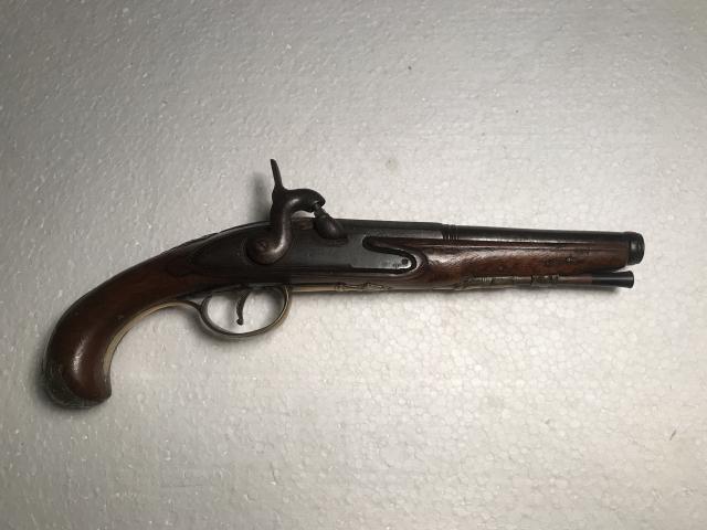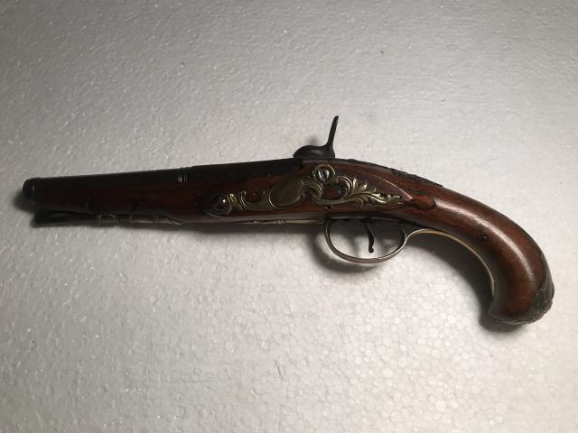 Frans percussie pistool getransformeerd van vuursteen cal.14 lang 30.5 cm messing beslag ca 18.00