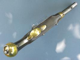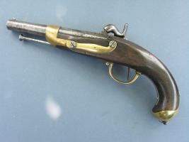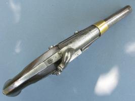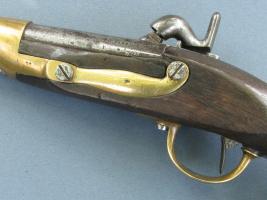 Mooi Frans percussiepistool model 1822 T cavalerie. Dit pistool model 1816 is oorspronkelijk gebouwd als vuursteenpistool en is later vanaf 1841 omgebouwd tot het percussie systeem. Het model heette daarna 1822 T. Na 1860 werden bijna alle pistolen omgebouwd naar het model 1822 T Bis. Dit pistool heeft die laatste transformatie niet ondergaan en heeft het originele slot met de vermelding "Manufacture Royale de Tulle". Gladde loop met klein vizier, gemerkt C 17.6. Het slot werk zeer goed en de haan spant met strakke veer in twee standen. Het hout is erg mooi met gebruikssporen passend bij de leeftijd. Al het messing beslag heeft keurmerken. Metalen laadstok met merkteken V. |