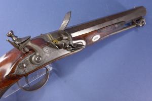Engels vuursteen pistool gemaakt door “Thomas Gill” rond 1790-1800 in zeer goede staat. Gladde achthoekige loop kaliber 17,5 mm met boven op de loop het opschrift “LONDON” , gegraveerde tang met gouden bandversiering. Goed werkend vuursteenslot met met veiligheidsschuif wanneer gespannen in de eerste klik. Verguld zundgat. Waterdichte pan met een typisch Engelse rol op de batterijveer. Slotplaat gesigneerd “T Gill”. Notenhouten kolf met checkered greep mooie patine en zilveren duimplaatje, kleine restauratie aan de lade rechtsvoor. Geďntegreerde metalen laadstok.