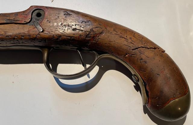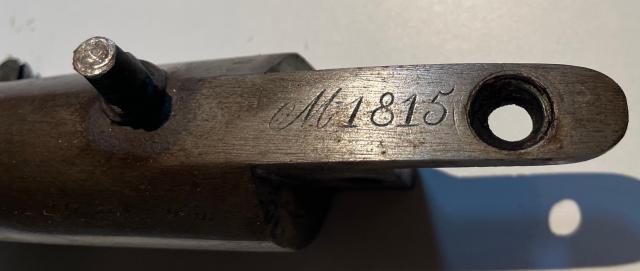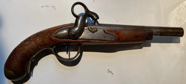 M1815 vuursteen pistool geconverteerd naar percussie. Metalen delen in  goede staat. Overal mooi gestempeld. Mist loopband met korrel. Originele piston. Hout is helaas door houtwormen veranderd in gatenkaas waardoor de kolf gebroken is. Blijkbaar ooit rood geschilderd geweest. Heeft u een goede kolf met minder goed ijzerwerk is dit een mooie gelegenheid om e.e.a. te upgraden