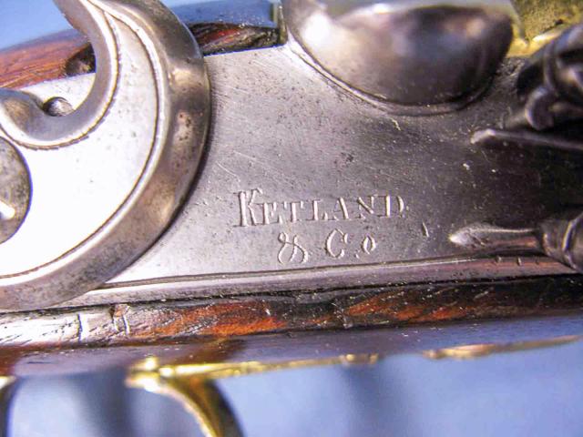 Engels marine vuursteen pistool gemaakt door "Ketland & Co" rond 1780-1790 in zeer goede staat. Gladde ronde messing loop kaliber 13,7 mm met boven op de loop het opschrift "LONDON" en met geometrische gravure tot het midden van de loop. Tang gegraveerd met florale motieven. Goed werkend vuursteenslot met vlakke slotplaat, in het midden gesigneerd "KETLAND & Co", met omlijnde randen. Notenhouten kolf met een op de achterkant een gegraveerd schild met monogram.