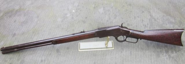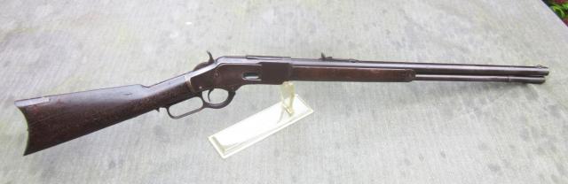 Betreft een leuke Winchester 1873 in caliber 44/ 40 met nog de mooie oude patina dus niet opnieuw geblauws,Loop s netjes voor de leeftijd en houtwerk ook.Bouwjaar is 1883 serie nummer 142vvv Aktie is ook goed ,alleen zit er een deukje voor in het buis magazijn voor de handige harrie makkelijk te herstellen Loop met duidelijke trekken / velden vandaar deze prijs.Ps deukje hinder het laden niet