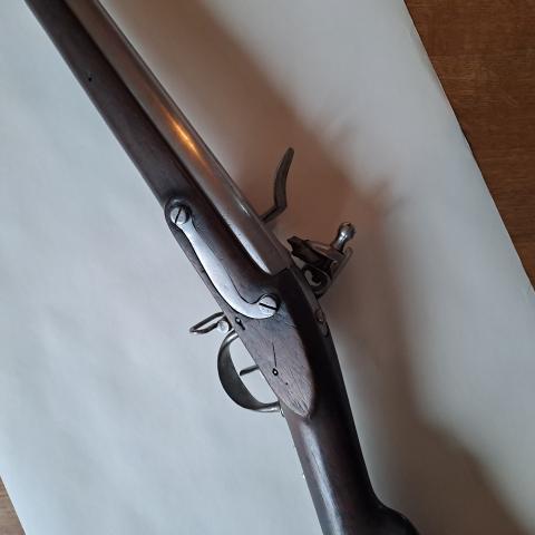 Mooi geweer, goedwerkend slot en batterij. Getrokken loop! Lengte: 123,5 cm, kaliber 17,5 mm, lengte van de loop 84 cm. Messing loopbeugels. Diverse proefmerken, geen specifieke aanduiding plaats van fabricage of model. Model lijkt op Frans 1777 Corrigé.