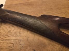 Dit exemplaar heeft een fraai gegraveerde bascule met subtiele krulgravures en een mooie, diepe patina die past bij de leeftijd. De kolf is voorzien van strakke, fijn gesneden checkering met goede grip en een open skeletkolf (uitsparing in het schouderdeel), wat het geheel een slanke en onderscheidende uitstraling geeft.