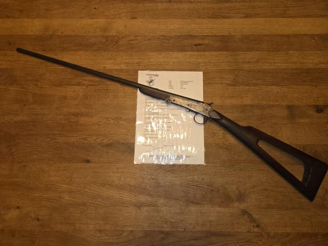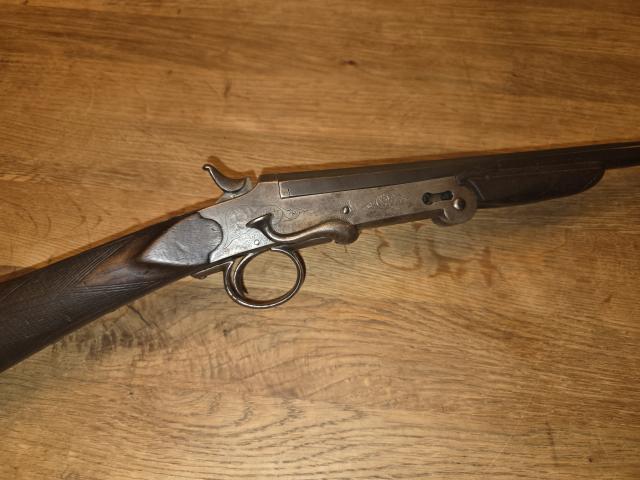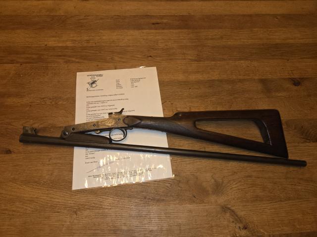 Dit exemplaar heeft een fraai gegraveerde bascule met subtiele krulgravures en een mooie, diepe patina die past bij de leeftijd. De kolf is voorzien van strakke, fijn gesneden checkering met goede grip en een open skeletkolf (uitsparing in het schouderdeel), wat het geheel een slanke en onderscheidende uitstraling geeft. Het plooimechanisme werkt zoals het hoort: degelijk en solide. Het is een licht en handzaam geweer, ideaal voor klein wild of als stijlvol verzamelstuk in een historische collectie.