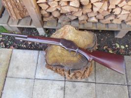 Winchester model 1887, geheel compleet, serienummer 18688. Geen roest aanwezig. De binnenkant van de loop heeft wat pitting. Kolf en voorhoutplaatjes zijn in prima staat, geen scheuren en mooi aansluitend op het metaal. De looplengte is 20 inch, niet de originele lengte. |