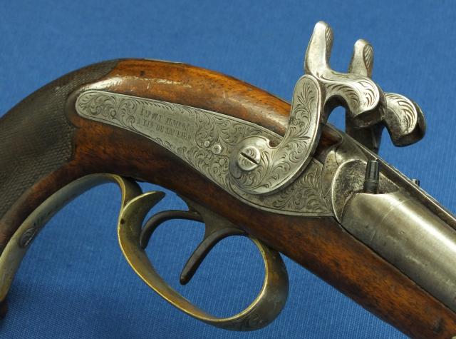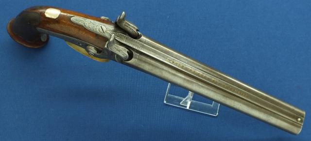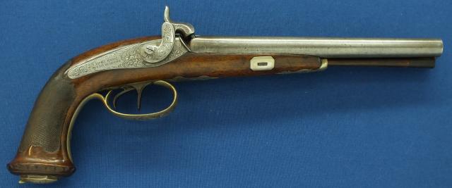 Een mooi en aparte Luikse/Braziliaanse Dubbelloops perkussie pistool met Damast lopen van Laport Irmaos (Laport Freres) A Rio de Janeiro. Mooie kolf met Berlijns Zilveren beslag. Kaliber 14mm. 39,5cm lang. Gemaakt in Luik voor Braziliaanse markt.