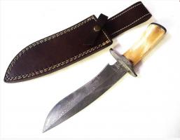 Oud bowie damascus mes met schede. Lengte 35 cm. Lemmet gemaakt van damascus staal. Handvat gemaakt van mooi gevlamd been. Schede is naderhand op maat bijgemaakt.