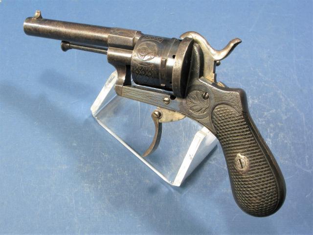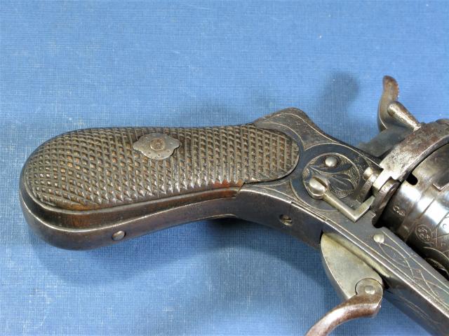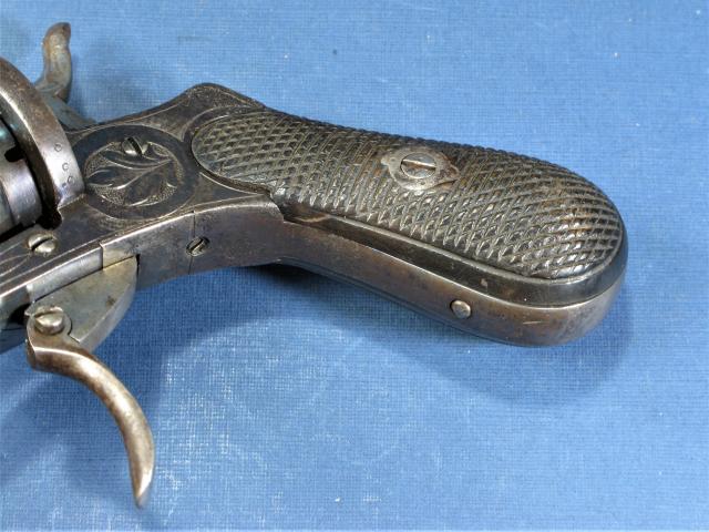 Mooie geblauwde 7 mm 6 schots penvuur revolver in zeer goede originele staat. Luiks ELG keurmerk en een inspecteurs keurmerk op de cilinder. Perfect werkend mechanisme in zowel sa als da. Checkered ebbenhout kleurige greepjes in mooie staat. Voorzien van laadpoort en uitwerpstang.