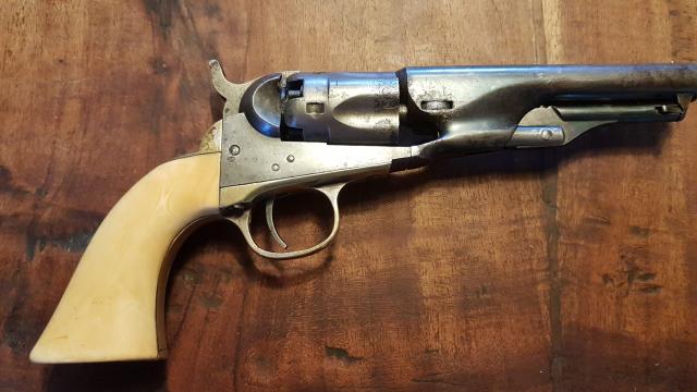 4 1/2 inch barrel, gemaakt in 1870, serienr. 43284, nummergelijk, geen nr. op de wedge. 5 schots, cal. .36. De grepen zijn origineel. Ze zijn genummerd en passen bij de rest van het wapen.