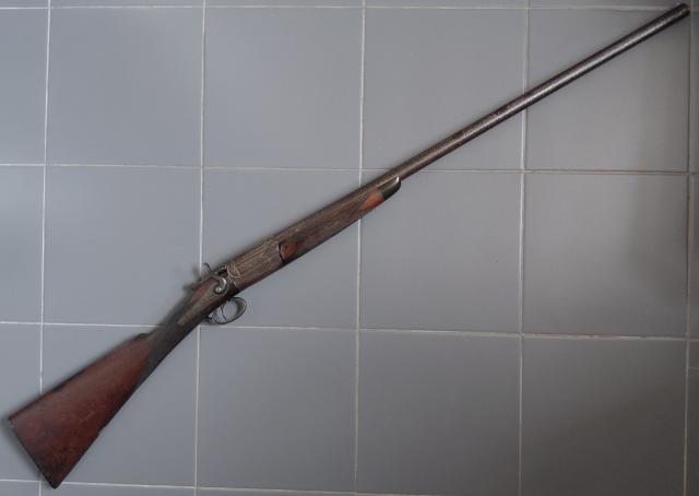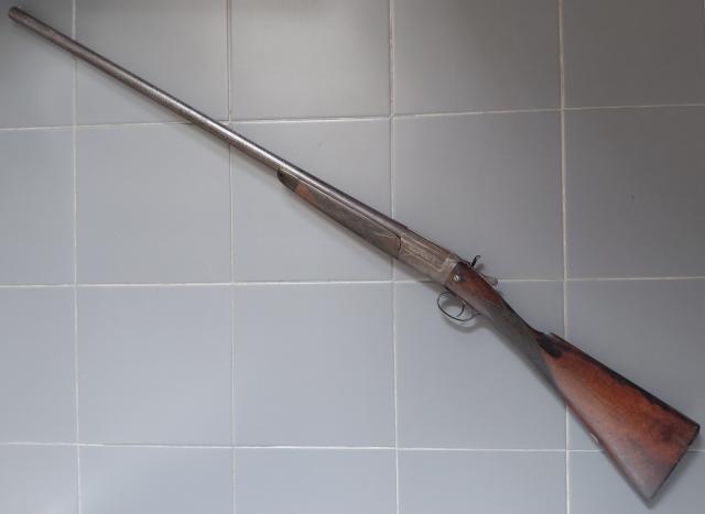 Aangeboden: Antiek Brits enkelloops hagelgeweer in kaliber 12 met toplever sluiting.