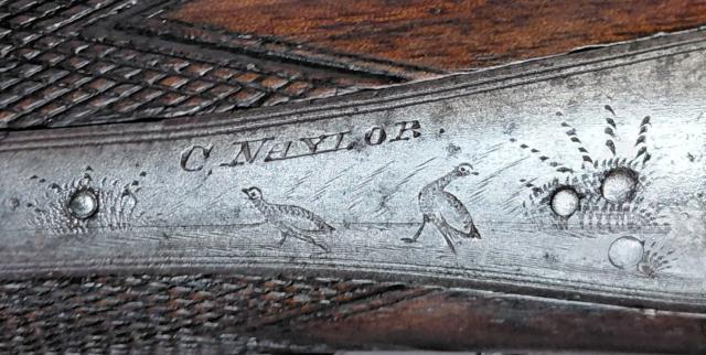 Het geweer is in nette, gebruikte staat. Hij spant en sluit netjes en inwendig is de loop nog mooi glad met slechts wat lichte spikkeltje/plekjes aan pitting. Het geweer is gemaakt door de Britse geweermaker C. Naylor en is voorzien van Britse zwartkruit proefbankstempels. Een enkelloops (Brits) hagelgeweer in kaliber 12 met toplever sluiting zie je niet zo vaak als de dubbelloops variant...