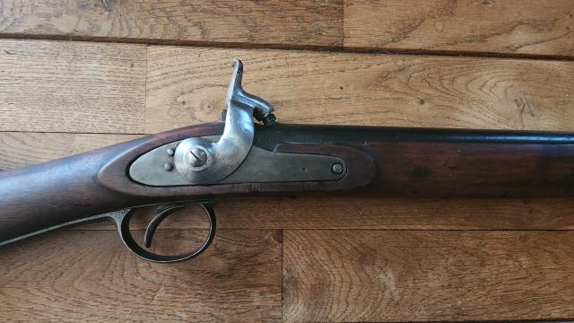 Gladloops antiek geweer circa 1850, goede staat met blauwering. Eerst vuursteen geweest. Waarschijnlijk m1822T loop circa 1830 op een Enfield p.1853 kolf. Voorhout tbv de sport hersteld. Kolf en loop extern zeer net, geen goedkoop khyberpass of houtworm spul. Met pompstok. Geweer vrijgesteld van vóór 1 januari 1870. Dit is volgens RWM art. 18 vrijgesteld en vrij te verkopen. Wordt niet verkocht onder de 18 jaar. Niet verwijderen aub. Zie marktplaats voor meer fotos