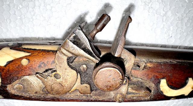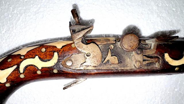 Lang - 94cm, Gewicht-950g. Het vuursteenslot kan worden gespannen en ontspannen maar het pistool wordt uitsluitend als decoratief historisch object. Bieden vanaf 100 Euro