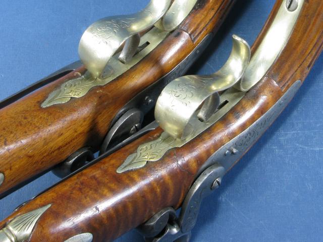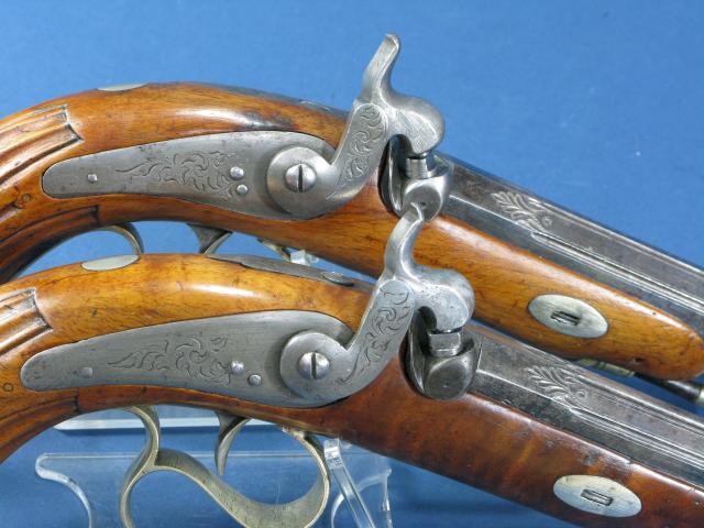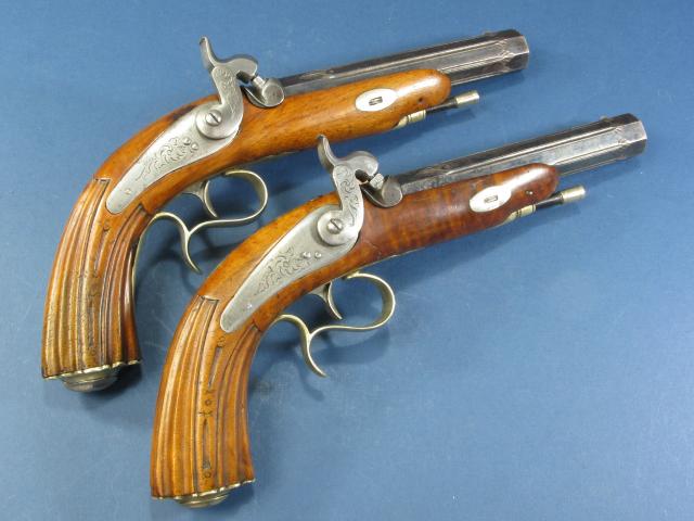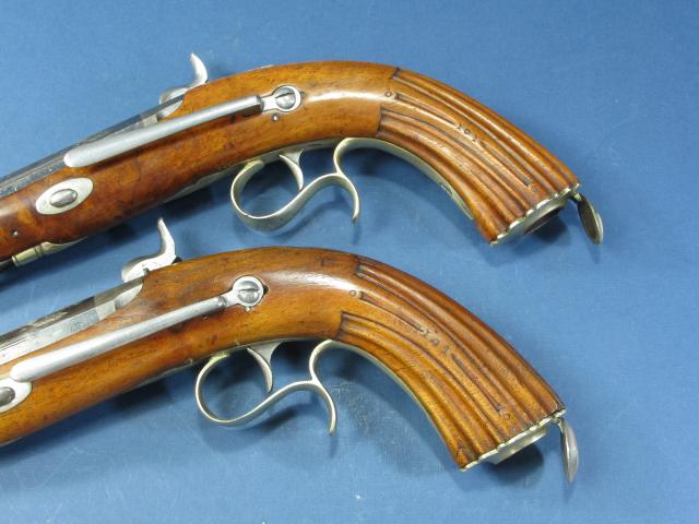 Prachtig koppel percussie pistolen Caonon Dacier uit de eerste helft van de 19e eeuw. Achthoekige geblauwd stalen loop, kaliber 17,5 mm. Gegraveerde tang en voorliggende goed werkende percussiesloten. Gegraveerd beslag van berlijns zilver. Mooi walnotenhouten kolf met renaissance type grepen, eentje met een restauratie. In de grepen ruimte voor percussie caps. De pistolen zijn voorzien van riemhaken wat zou kunnen duiden op een maritieme oorsprong. Houten laadstokken. Lengte: 32 cm.