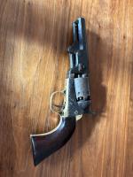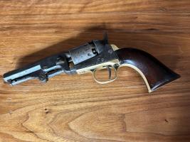 Colt Pocket Percussion Revolver uit de 19e eeuw. Dit compacte en elegante wapen was een favoriet van vele reizigers en stedelingen tijdens het midden van de 19e eeuw, dankzij zijn betrouwbaarheid en handzaamheid.